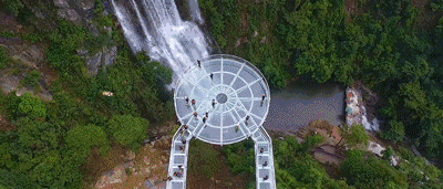 懸空玻璃平臺全長202米,以72米的懸空跨度名列世界第一,為美國科羅拉多大峽谷的U形橋(21米)的3.5倍;點睛之筆是平臺頂部直徑16.8米的玻璃觀景圓臺,這是和瀑布親密接觸的絕佳位置。圓臺中間獨具匠心地設計了網格狀鏤空,山風穿透,頓生寒意;踏步其上,如墜深淵,令人心驚膽寒。