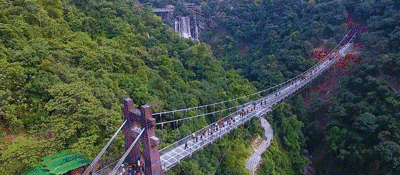 古龍峽觀瀑玻璃橋,位于景區萬丈崖瀑布群核心景點內,全長339.2米,平均寬度3.8米,最大寬度6.8米,創CWRA“世界上最寬的觀瀑玻璃吊橋”世界紀錄。